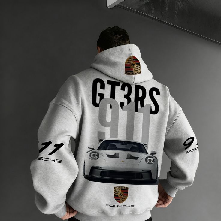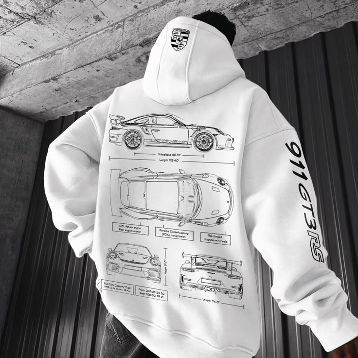 Premium quality streetwear hoodie inspired by the legendary Porsche 911 GT3 RS, featuring a detailed blueprint-style graphic design on the back.